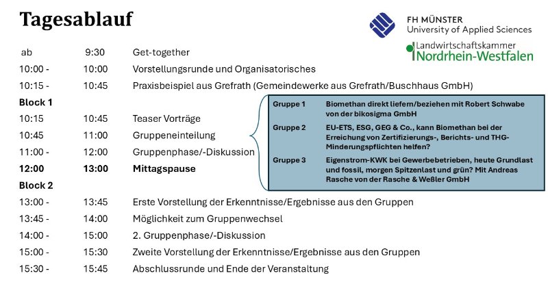 Die Landwirtschaftskammer NRW und das VeBiT Projektteam der FH Münster laden zum interaktiven Workshop ein. Die Themenbereiche Direktlieferung von Rohgas, Biomethan, Strom und/oder Wärme werden unter technischen, rechtlichen und administrativen Fragestellungen diskutiert. Wie kann Biogas/Biomethan bei der Erreichung von Verpflichtungen aus GEG, ESG & Co. helfen? Ist die Spitzenlastversorgung aus einem Biogas BHKW möglich? Wie funktioniert der Biomethanhandel aus Erzeuger- und Nutzerperspektive?